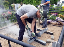 Затем переходим к установке памятника: аккуратно принесли гранитное надгробье на могилу, далее по месту распилили каменные балки, из которых в дальнейшем и собирается цветник. Параллельно в памятнике проделываем отверстия для насадки на штыри, которые обеспечат наиболее эффективный крепёж.