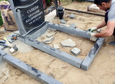Первым делом мы подготовили участок к работам: демонтировали уже установленное надгробье, а также разровняли почву на могиле, тем самым подготовив её к укладке наземного покрытия.